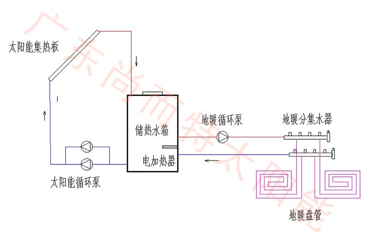 ②:有水泵提供循环的动力。因为太阳能采暖系统所加热的热水是存在水箱中的,如果没有动力提供的话,只会压垂直向下运动,而不会循环。所以说这个时候一般要安装一台专用的循环泵。其实在普通采暖系统的任何过程中,也就是水地暖中,都有循环泵。太阳能采暖当然也不例外。我们要利用这台循环泵来实现供水和回水在我们室内管道与水箱之间的循环,这样就保证了供回水在室内的循环。